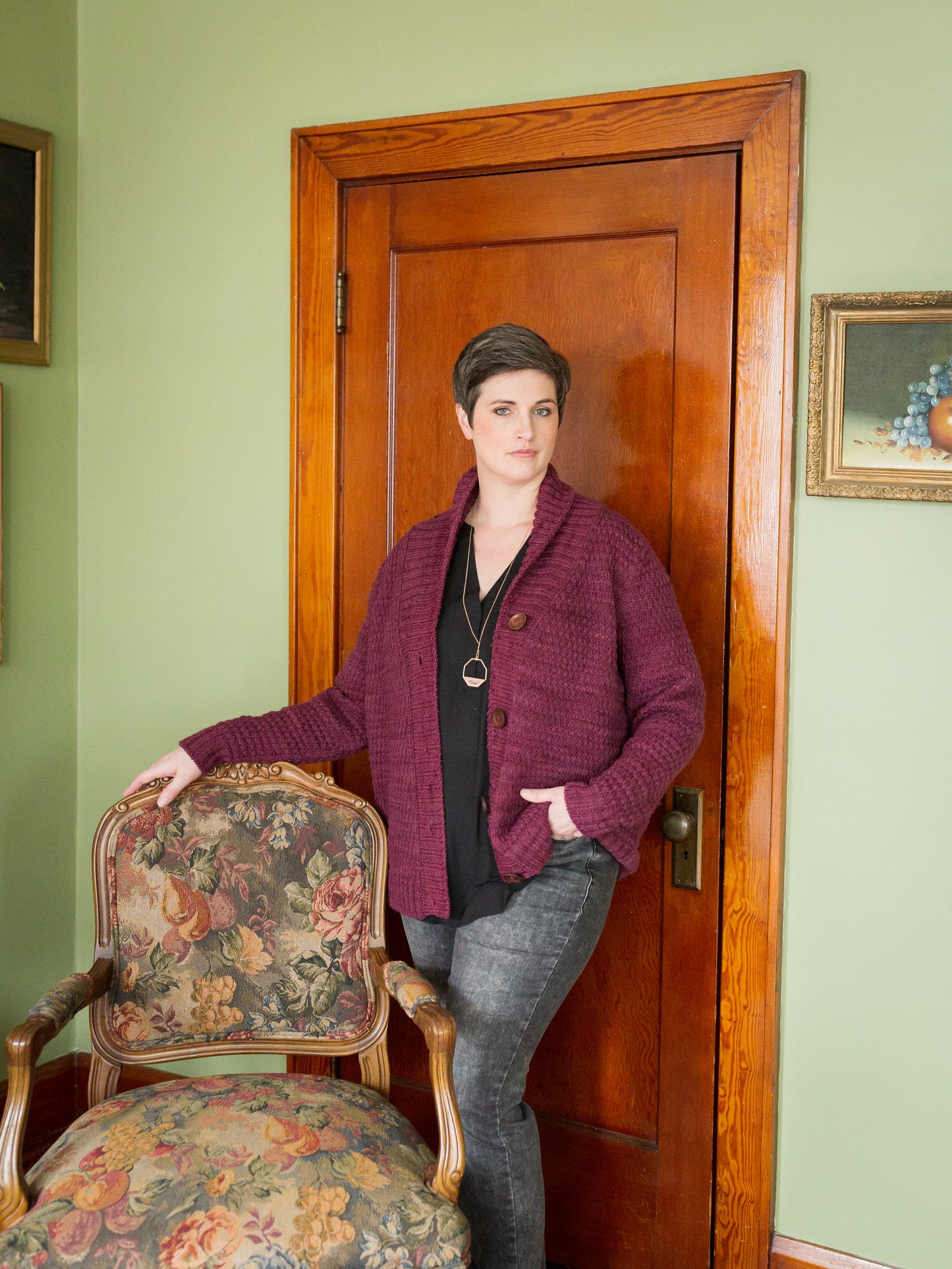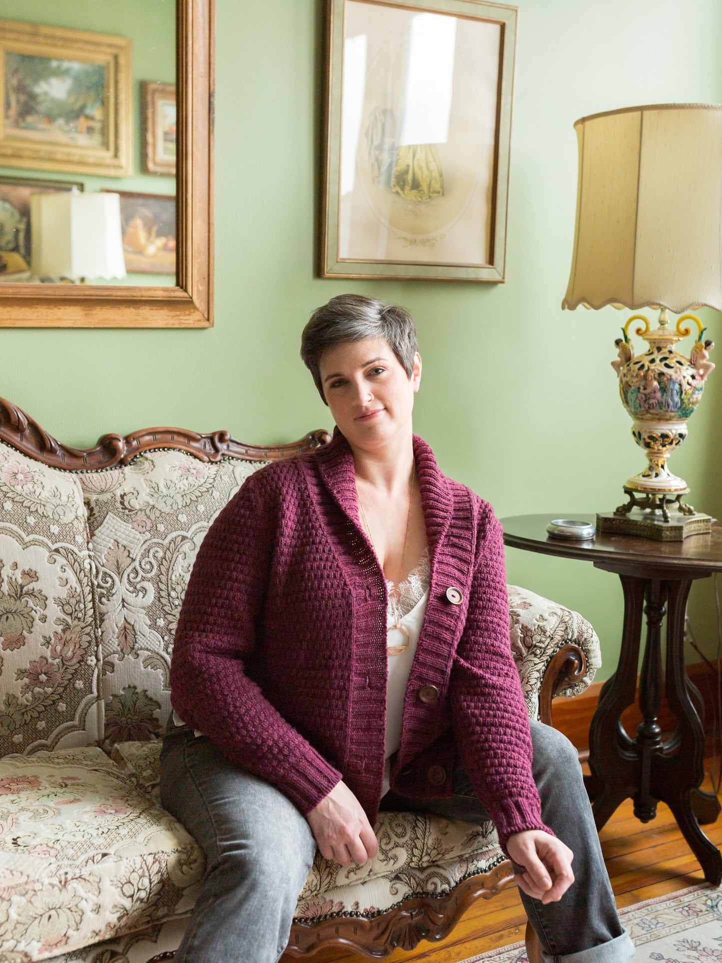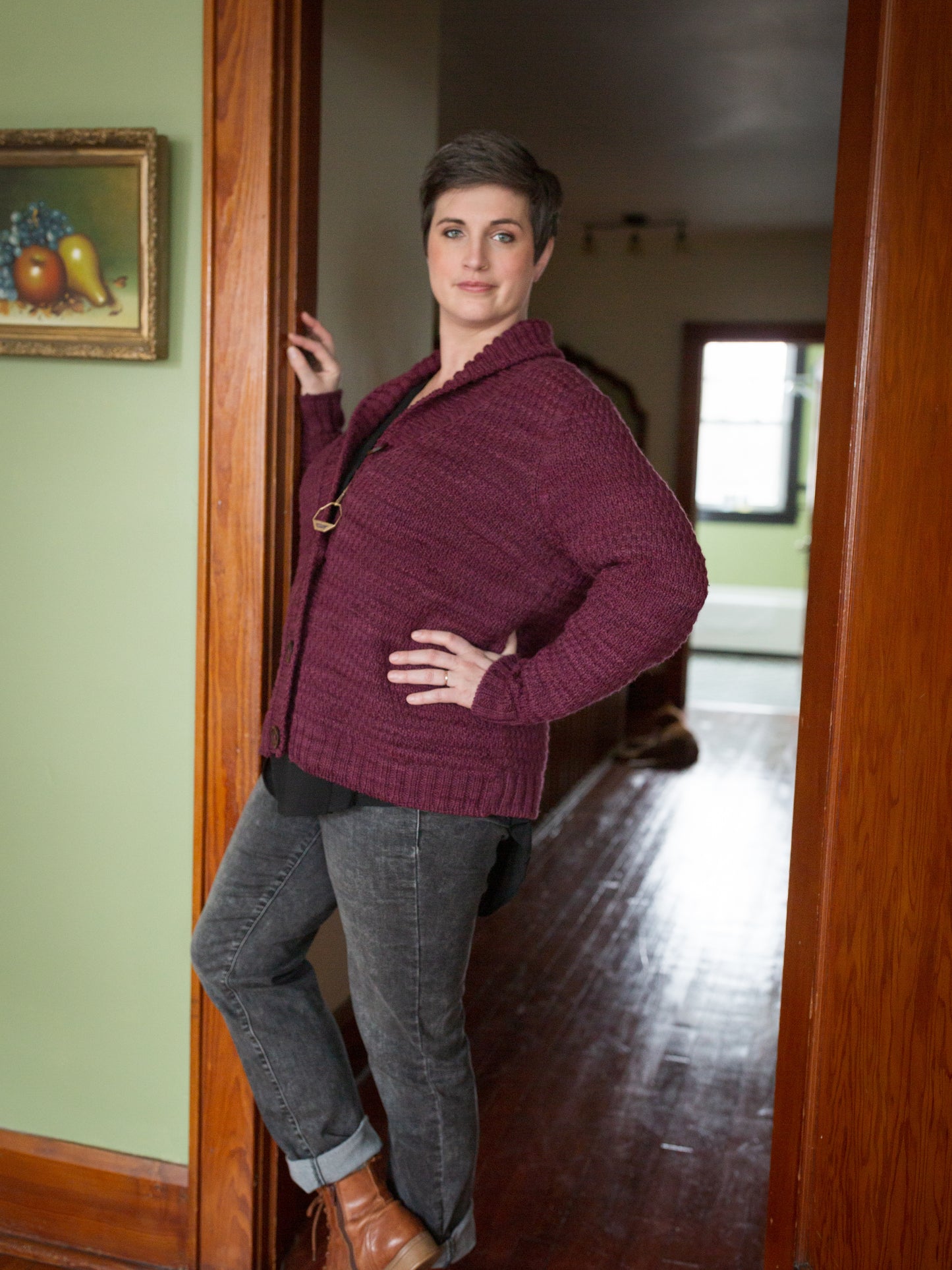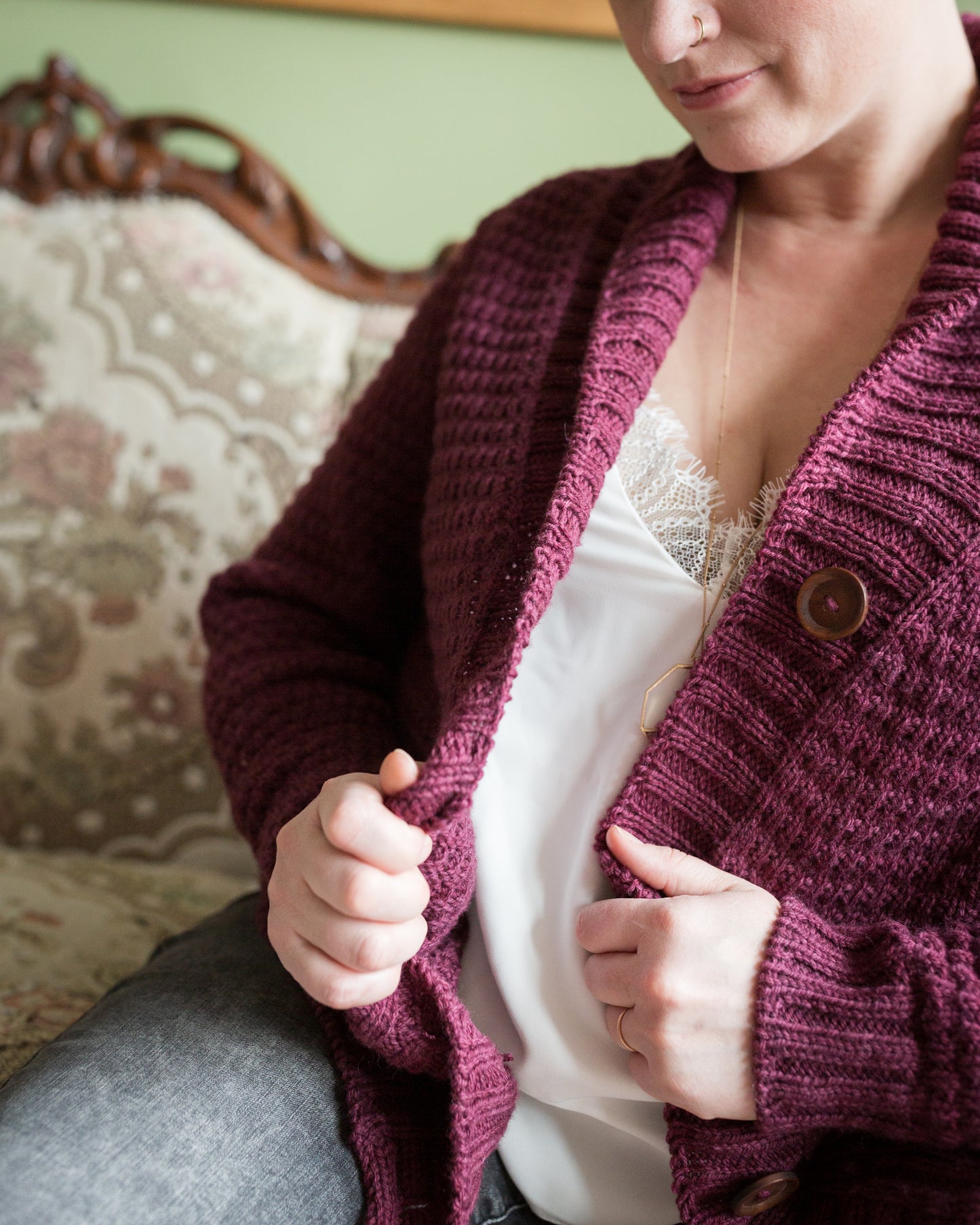 Postscript is worked bottom-up in pieces and seamed with set-in sleeves. Stitches are picked up and knit for the shawl collar and button band. The hip is wider than the bust.