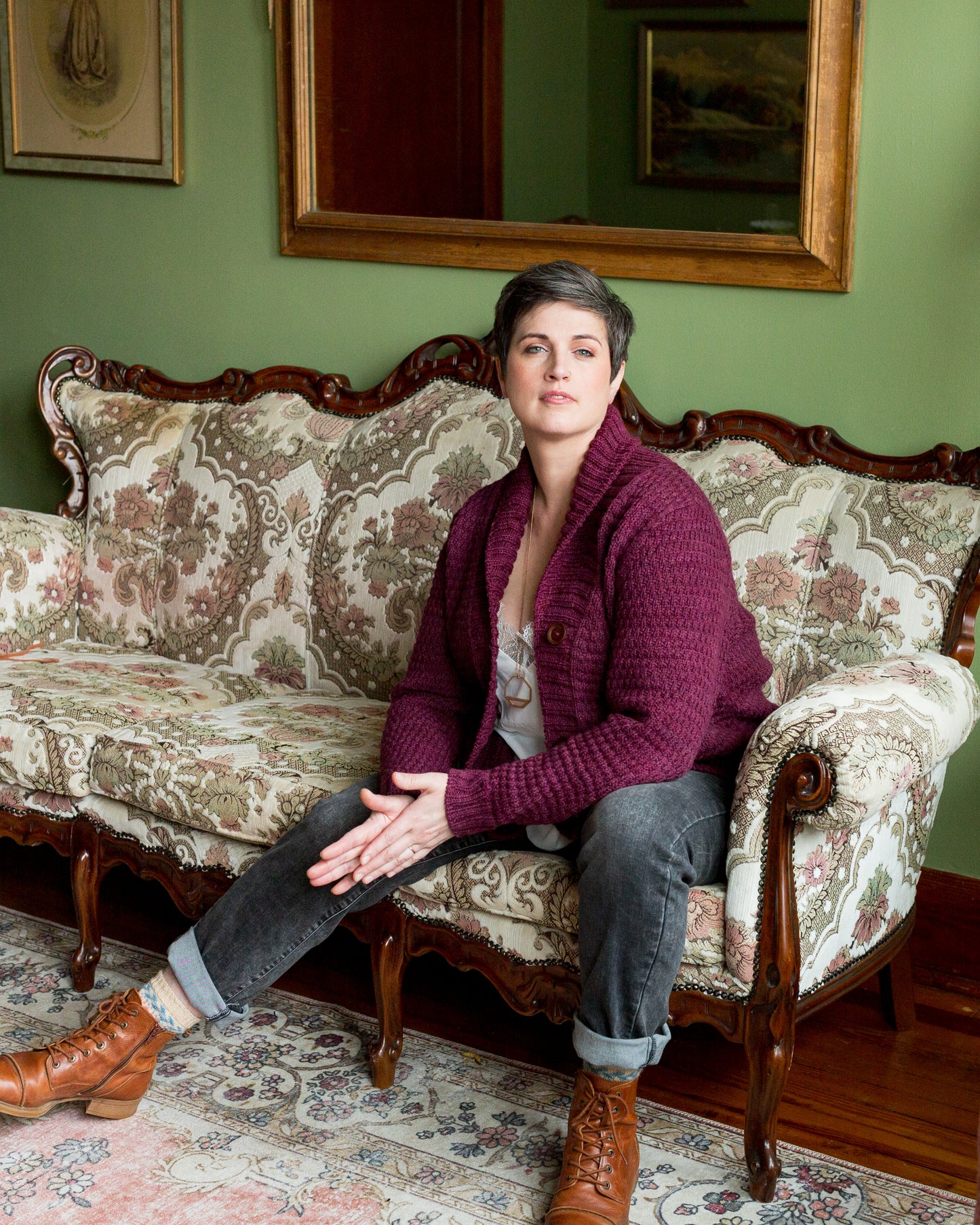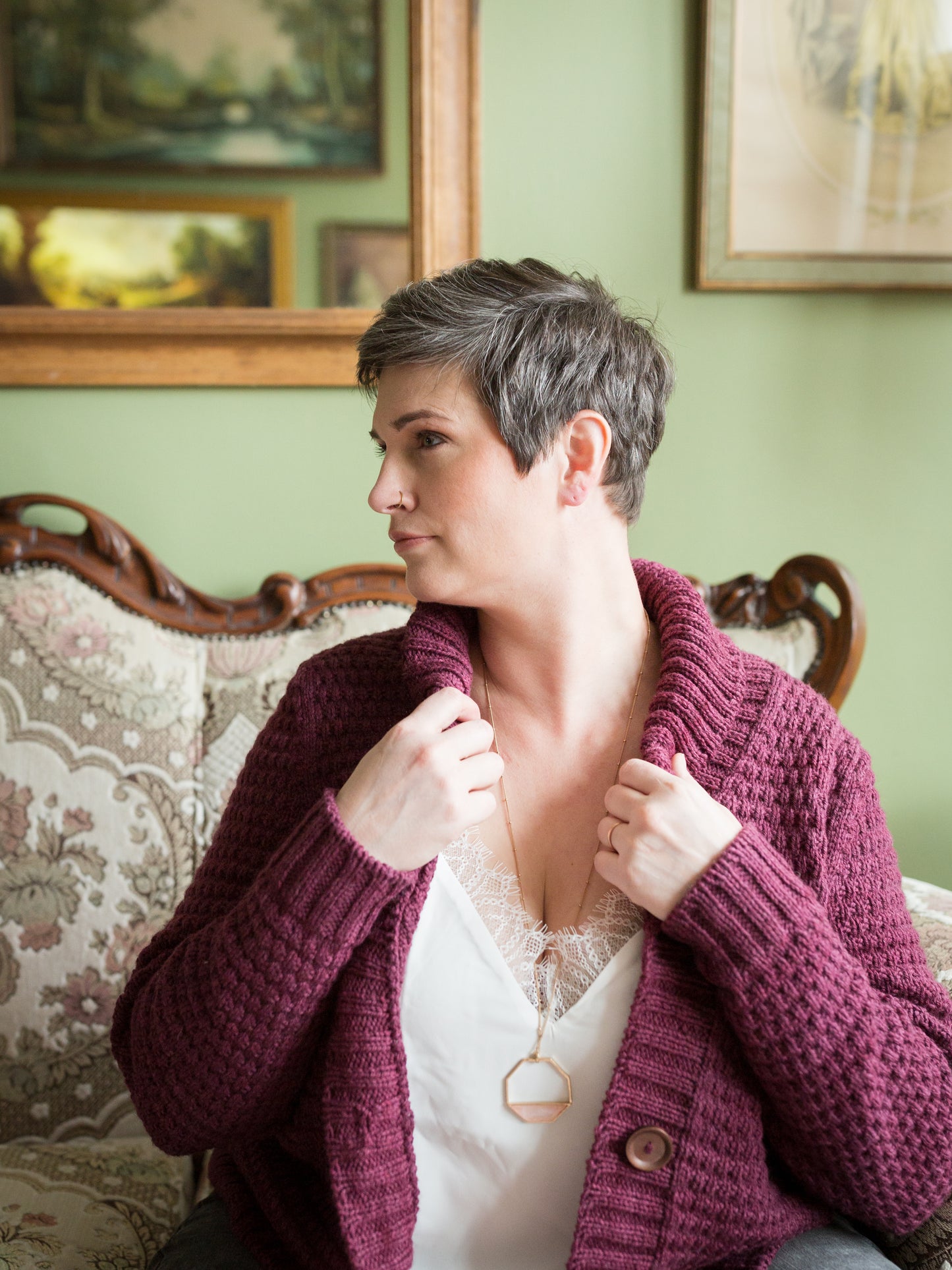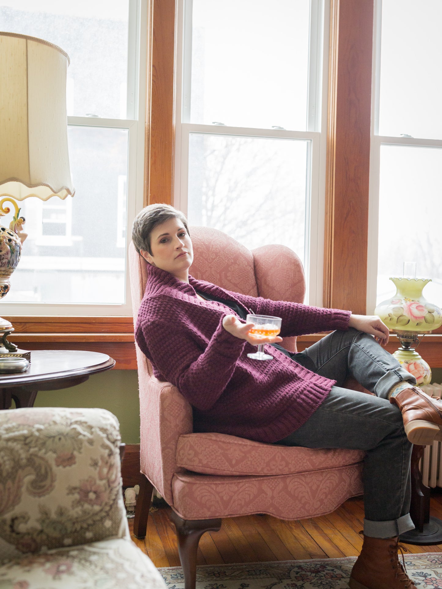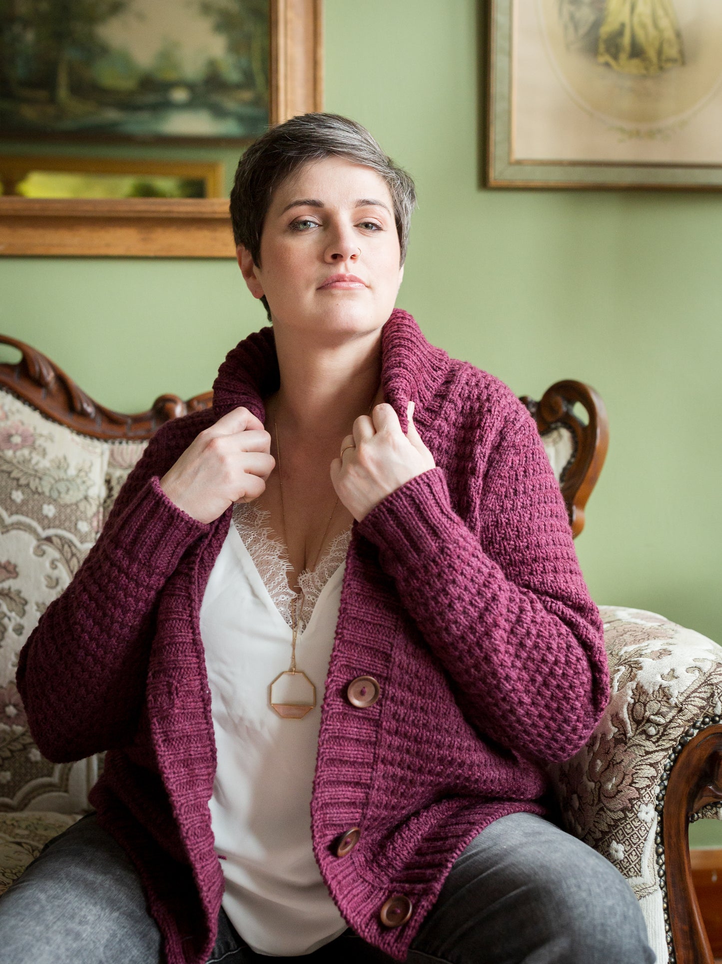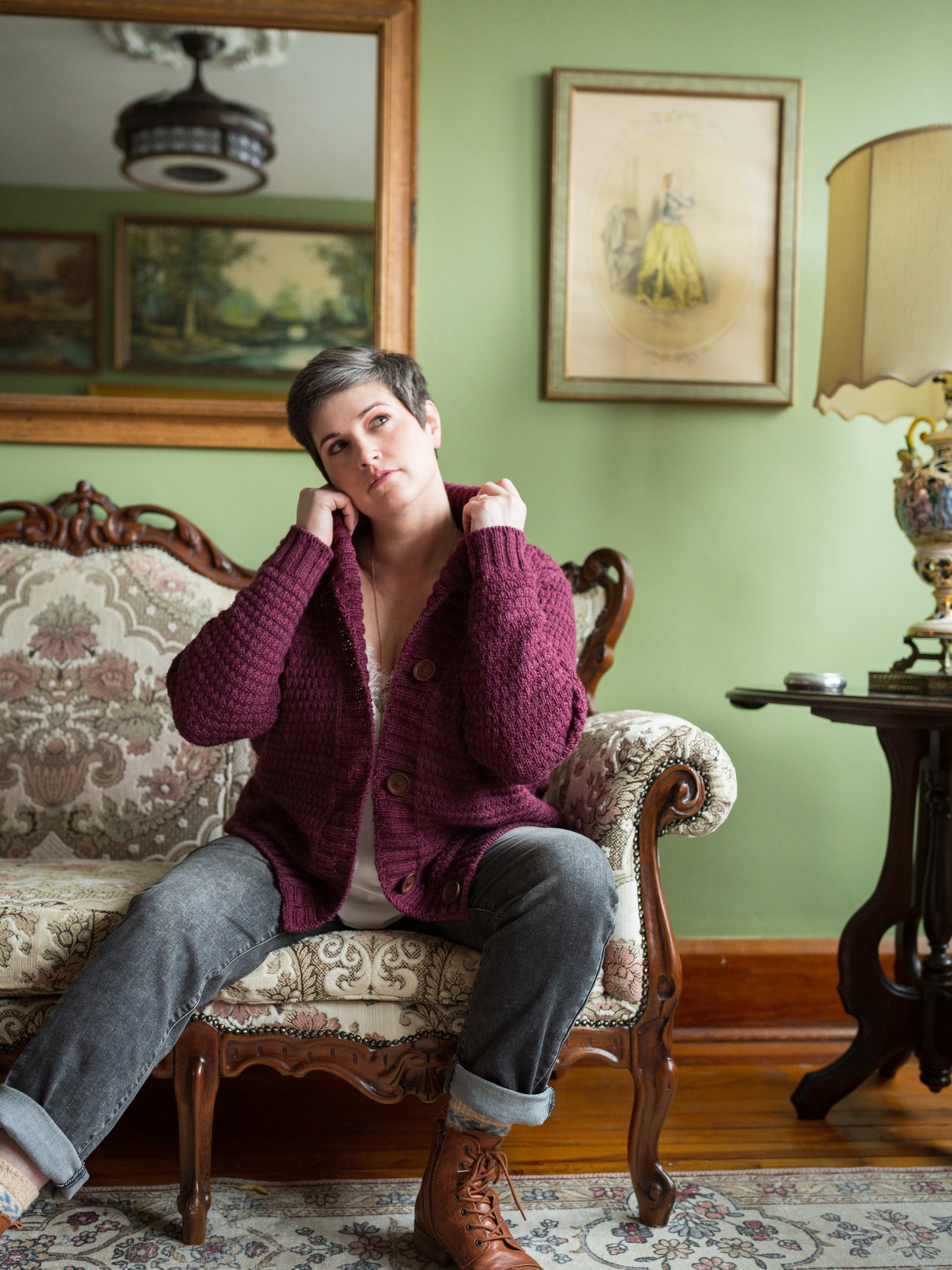 Postscript is worked bottom-up in pieces and seamed with set-in sleeves. Stitches are picked up and knit for the shawl collar and button band. The hip is wider than the bust.