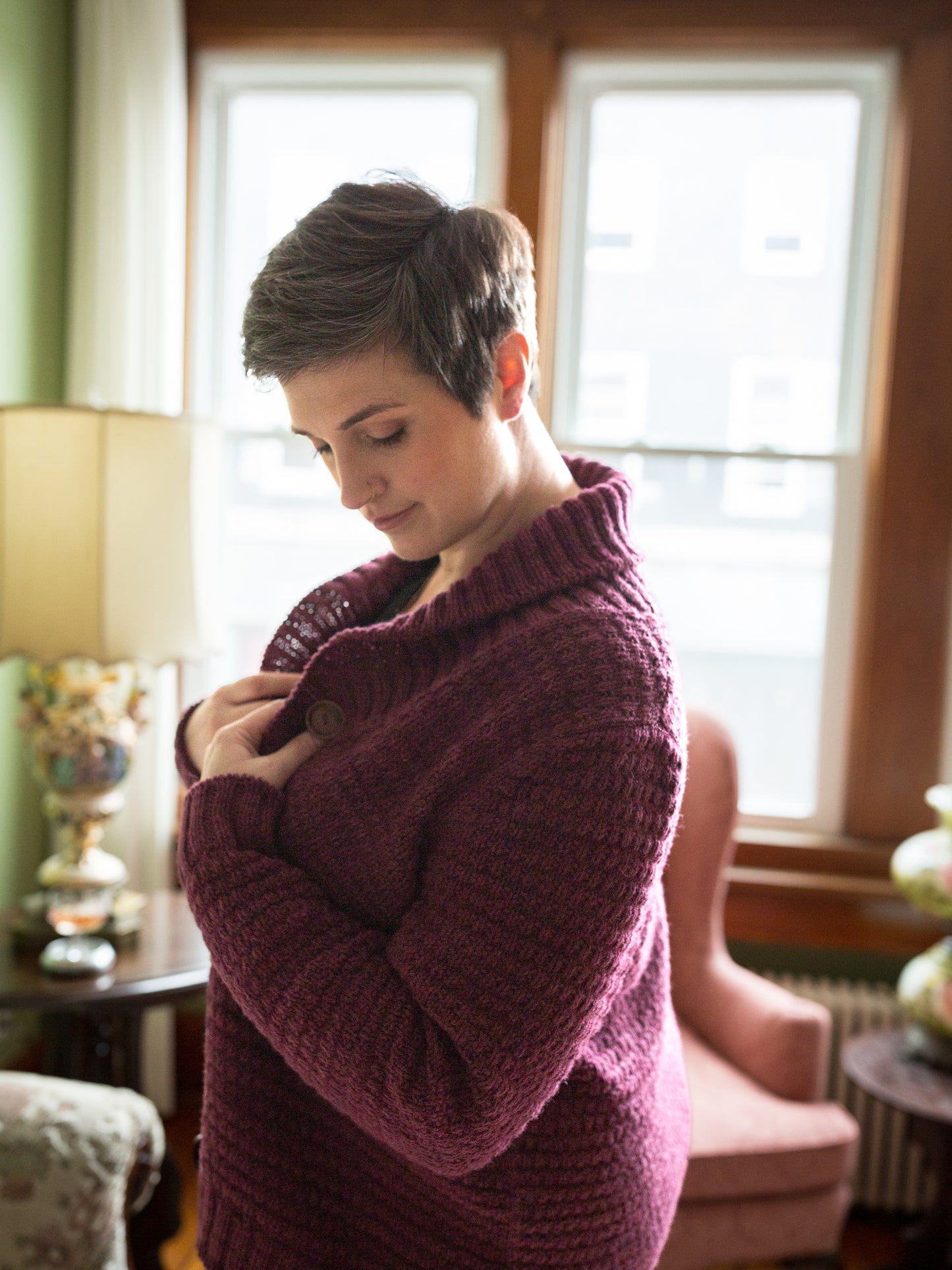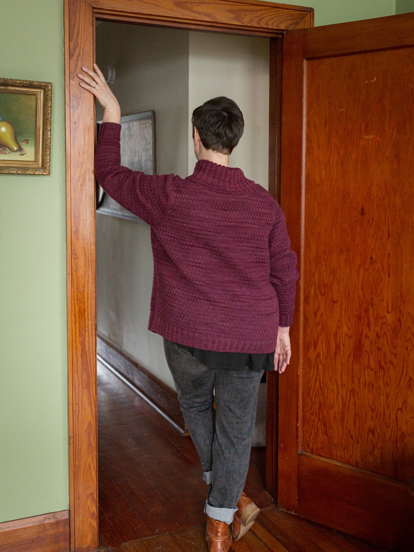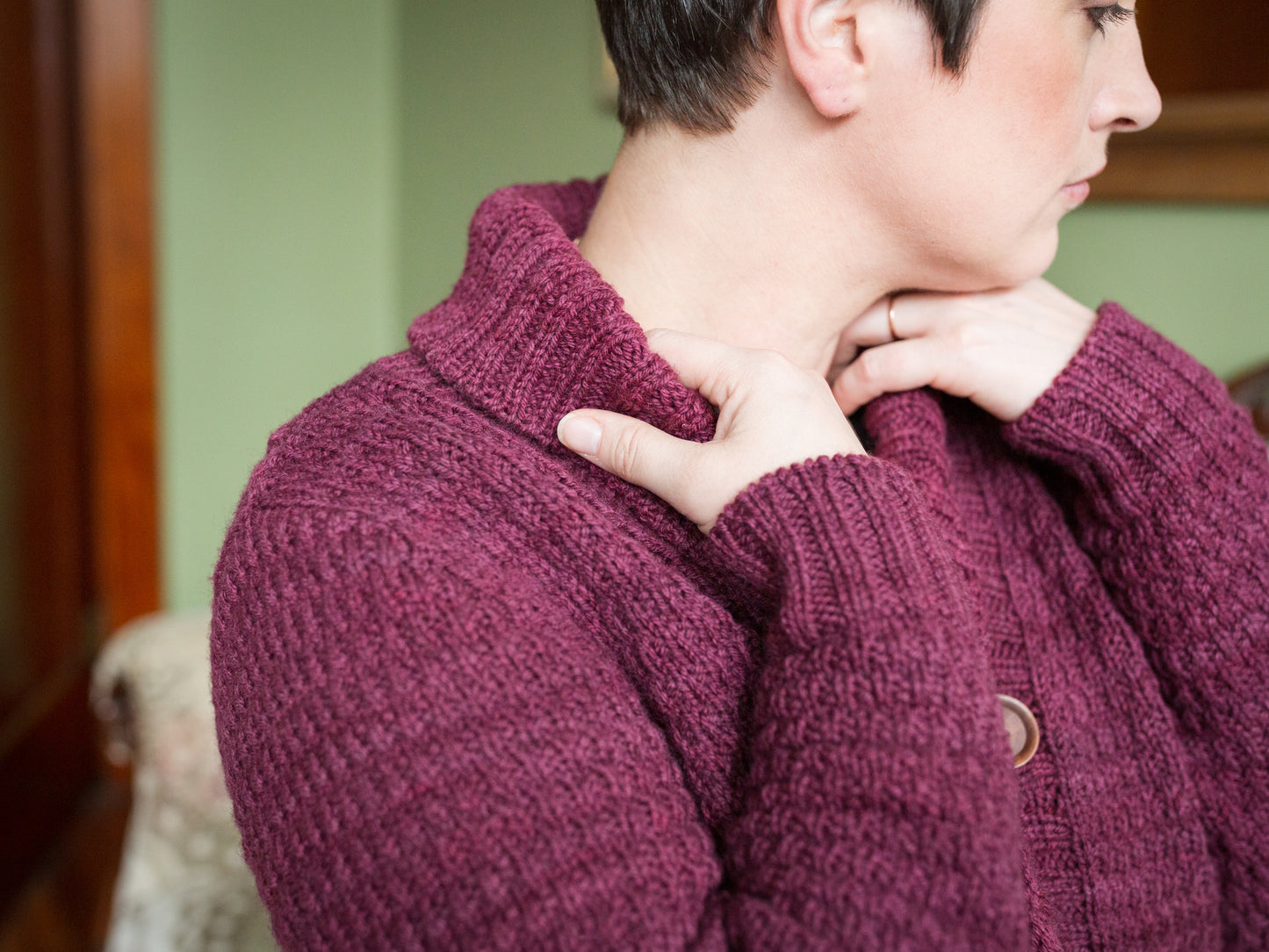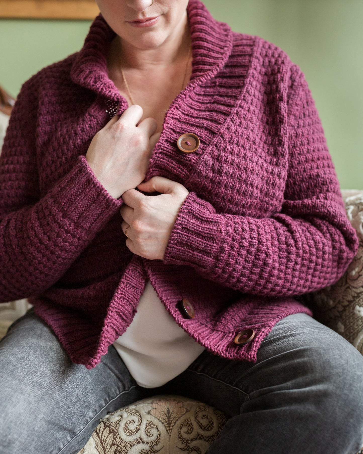 This elegant cardigan features a towering shawl collar and a graceful set-in sleeve. Shaping creates more room at the hip, giving you space right where you need it. A wide button band and large, simple, buttons adorn this cardigan, partnering perfectly with richly textured granite stitch.