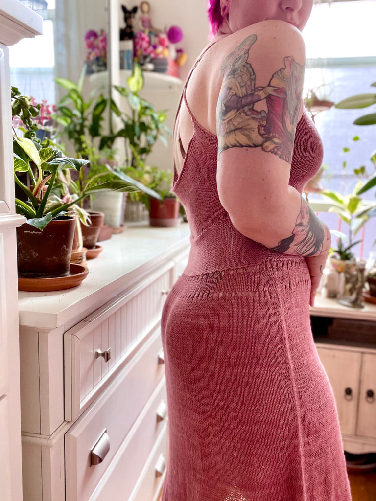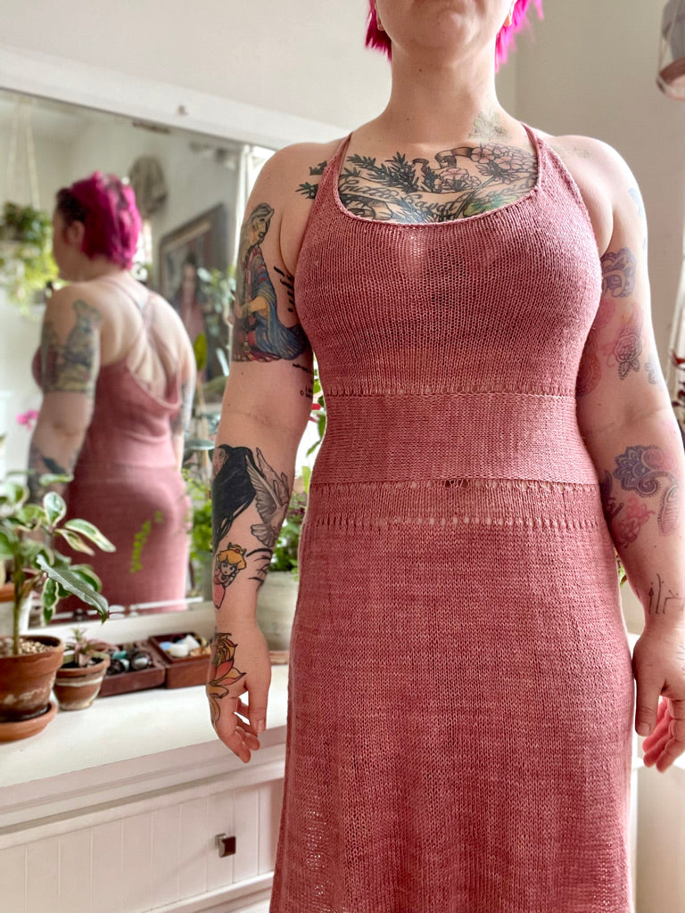Renard is knit flat for the waistband and seamed, then the remainder of the dress is picked up and knit. I-cord bind offs create structure for the armholes and neckline, and the straps are made with i-cords and grafted to the body.